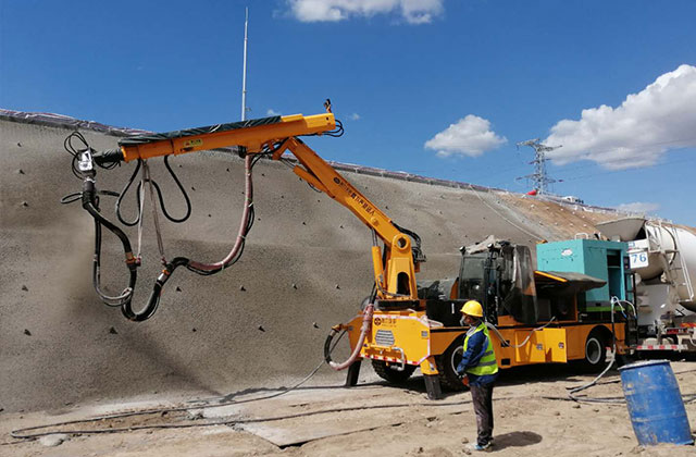 混凝土濕噴機械手是智能化高適應性濕噴混凝土設備,通過無線遙控器操作噴射臂的噴射位置和噴嘴的角度,減少了操作人員與混凝土的接觸,同時降低了粉塵濃度,改善了作業(yè)環(huán)境,保障了施工人員的身體健康。混凝土濕噴機械手廣泛應用于鐵路隧道、公路隧道、水利涵洞、礦山巷道、堤壩邊坡、建筑基坑和軍事工程等領域施工中的噴射混凝土支護作業(yè)。